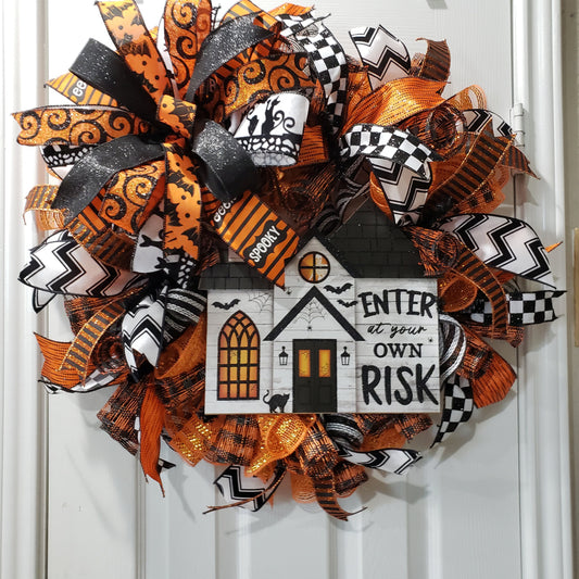 BOO, Halloween, haunted house, black cat, spooky wreath or door hanger