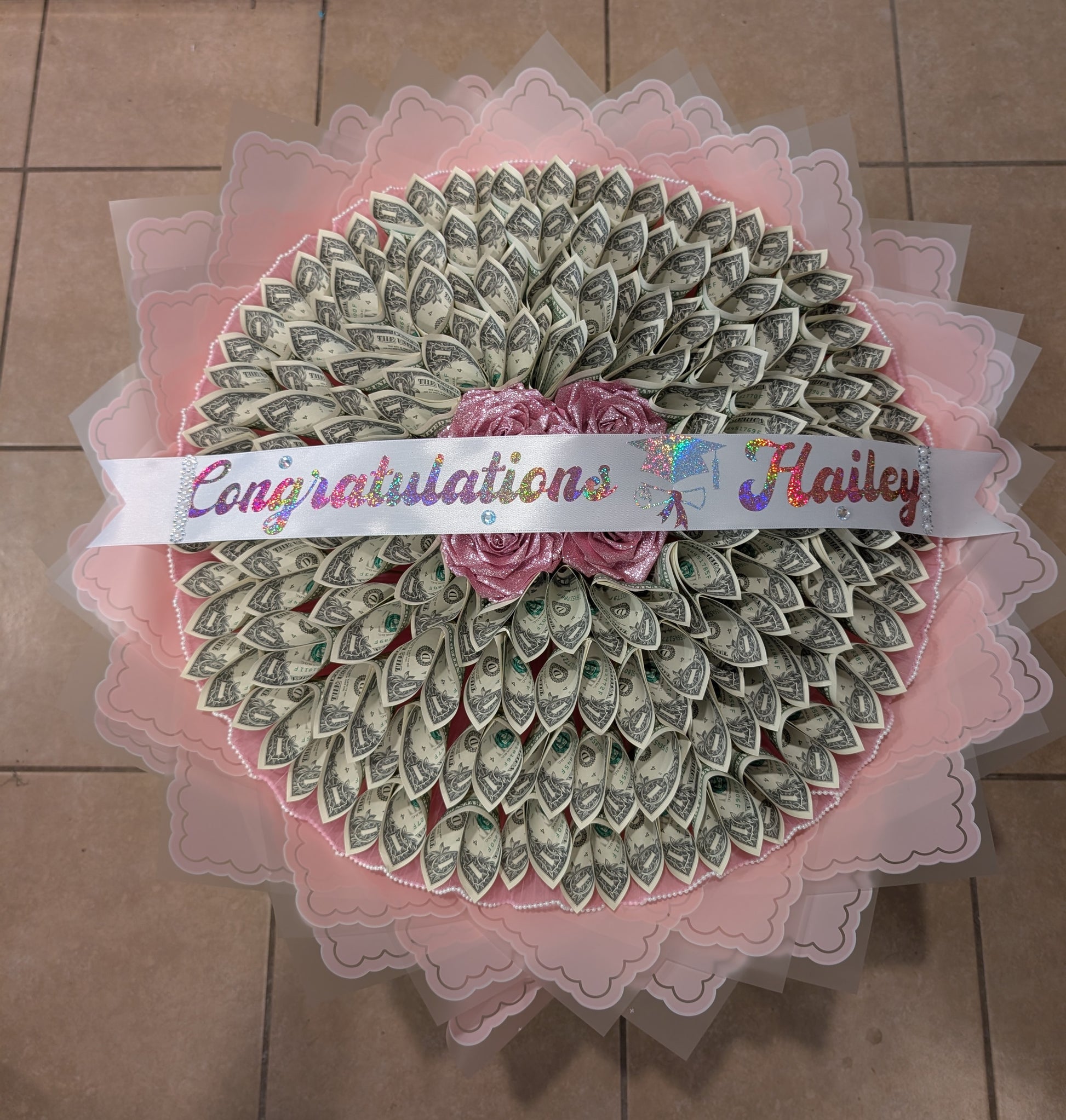 Choose the amount of $1 bills you would like placed around 6 faux foam roses spray with either gold or silver glitter (specify when you order) Placed in a light weight foam base and wrapped with beautiful gold trimmed black floral paper and bow.